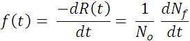 Thus, the failure density function represents the proportion of the original population, (NO), which fails in the interval (t, t + Δt).