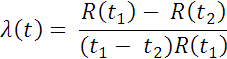 The rate at which failures occur in the interval t1 to t2, the failure rate λ(t), is defined as the ratio of probability that failure occurs in the interval, given that it has not occurred prior to t1, the start of the interval, divided by the interval length. Thus,
