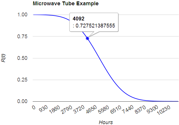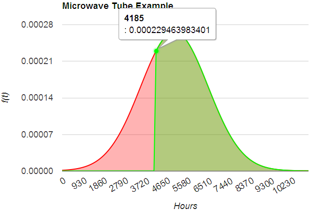 “The reliability at 4,100 hours is 0.73, as represented by the green shaded area to the right of the 4,100 hour point in the probability density function (pdf) plot shown below. The unreliability, or probability of failure, is 0.27, as represented by the pink shaded area to the left of the 4,100 hour point in the pdf plot.”