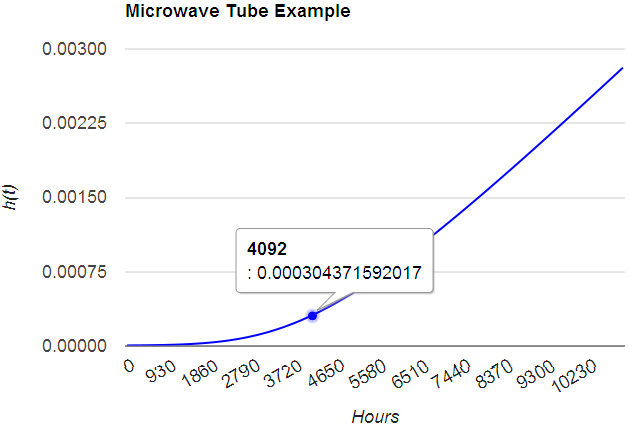 The hazard rate at the 4,100 hour point is approximately 0.0003 failures/hour, as shown in the plot below.