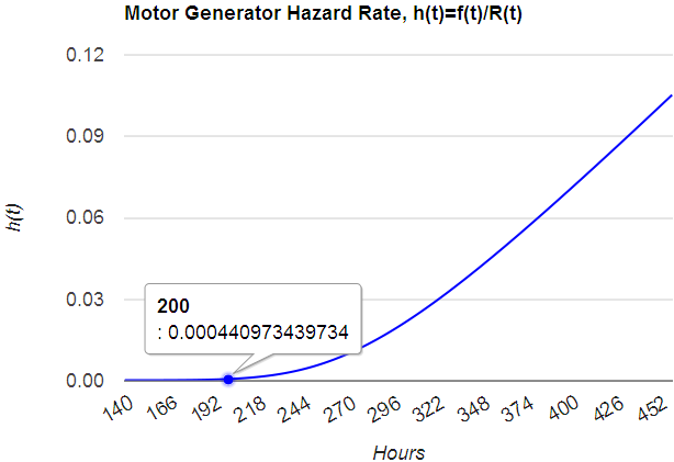 The hazard rate at the 200 hour point is approximately 0.00044 failures/hour, as shown in the plot below.