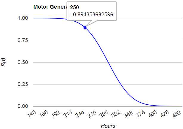 A motor generator has been observed to follow a normal distribution with μ =300 hours and σ = 40 hours. Find the reliability of the motor generator for a mission time (or time before maintenance) of 250 hours and the hazard rate at 200 hours.
