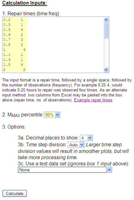 Paste the above input data into box 1 of the maintainability analysis tool and select 95% for the MMax percentile in the item 2 pull-down, as shown below. Note, the instructions below the box 1 input mention the input format is a repair time followed by a single space, then the number of observations; however, the tool will properly parse data with multiple spaces separating these two values.